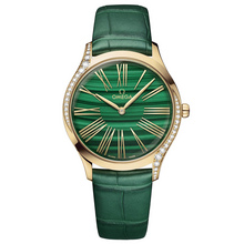 For this model, the slim 36 mm case is crafted in 18K Moonshine™ gold and features 38 full-cut diamonds, which curve elegantly along each side. The domed malachite dial includes applied and domed Roman numerals and diamond-polished hands all in 18K Moonshine™ gold, while the crown is engraved with an OMEGA flower, filled with red liquid ceramic and set with a single diamond.